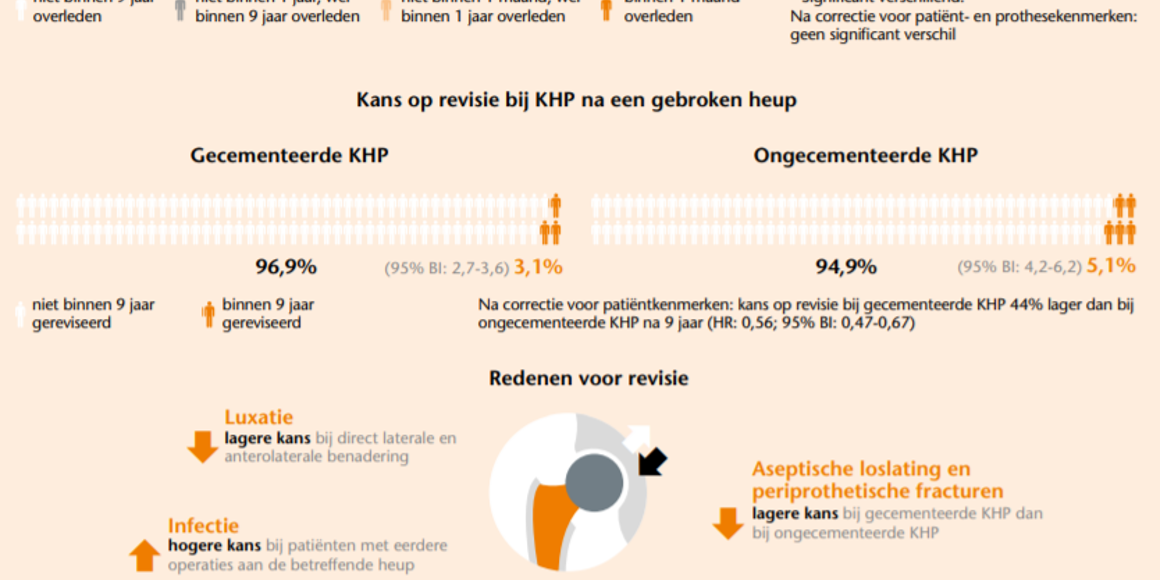 Het advies is om voor de prothesebehandeling van een gebroken heup een gecementeerde KHP te gebruiken omdat de kans op revisie lager is dan bij een ongecementeerde KHP. Bekijk ook de NL samenvatting met infographic.