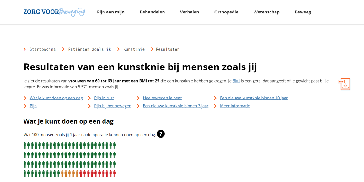Voor het door ZonMW gefinancierde project ‘Verduurzamen uitkomstgerichte zorg knieartrose’ van de NOV heeft de LROI de afgelopen periode een nieuwe tool ontwikkeld met daarin informatie over het resultaat van een totale knieprothese bij patiëntengroepen. Bezoekers van de website kunnen door vier vragen in te vullen (geslacht, leeftijdscategorie, lengte en gewicht) zien wat de resultaten van de behandeling waren bij mensen zoals zij.