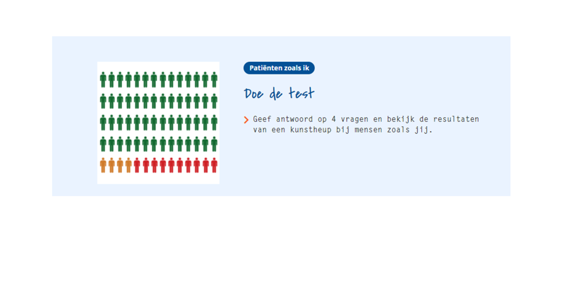 Door vier vragen in te vullen over geslacht, leeftijdscategorie, gewicht en lengte, krijgen patiënten uitkomstinformatie te zien van patiënten met diezelfde kenmerken.