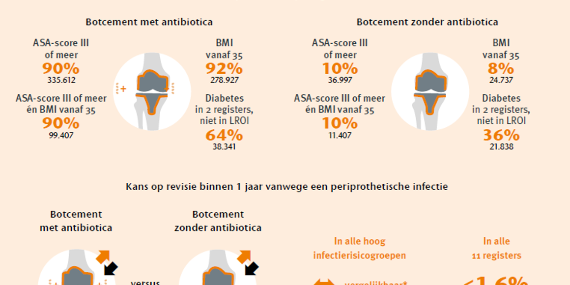 De onderzoeksgroep concludeert dat bij patiënten met een verhoogd risico op infectie (ASA-score III of meer, BMI vanaf 35 of diabetes) het gebruik van botcement met antibiotica niet gepaard lijkt te gaan met een lager risico op revisie vanwege een periprothetische infectie. Klinische studies zijn nodig om te bepalen of botcement met antibiotica extra voordeel biedt. Echter, de betrouwbaarheidsintervallen sluiten een klinisch relevant effect niet uit. Er is ook veel variatie tussen landen, waardoor het moeilijk is om één conclusie te trekken. Verder onderzoek is dus nodig.