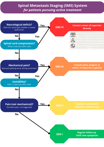 We hebben zakkaartjes ontwikkeld met daarop een soort flow chart, voor de behandelaars in de tweede lijn die dit soort patiënten vaak zien. Als eerste is de vraag: is er neurologische uitval? Zo ja, dan betreft het een spoedpatiënt, SMS4, en is het advies direct contact op te nemen met het centrum dat dit soort patiënten kan behandelen. Is er nog geen uitval, maar laat een scan wel zien dat de tumor het ruggenmerg volledig verdrukt? Dan is het ook SMS4, want de uitval kan elk moment optreden.