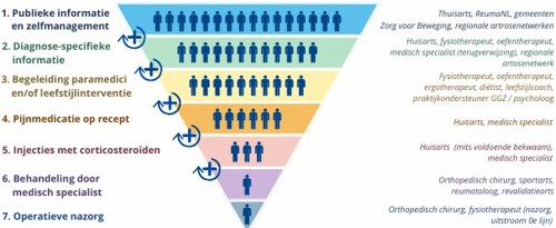 Een belangrijk uitgangspunt is dat een groot deel van de artrosepatiënten conservatief kan worden behandeld. De behandeling van artrose leent zich daarmee bij uitstek voor stepped care en regionale zorg over de lijnen heen. Door te starten met conservatieve behandelopties en alleen te verwijzen naar de orthopedisch chirurg indien nodig, kan protheseplaatsing worden voorkomen of uitgesteld. Stepped care is inmiddels opgenomen in de richtlijnen van medisch specialisten, huisartsen en fysiotherapeuten en vormt de basis voor de Toolkit Regionale samenwerking heup- en knieartrose.
